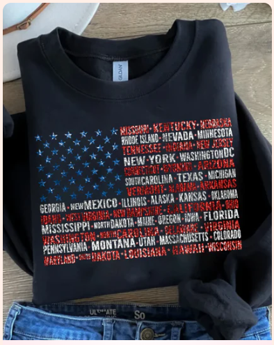 Celebrate American pride with this meticulously crafted American Flag featuring all 50 states. Enhanced with real glitter, it offers a vibrant, eye-catching sparkle that highlights each state’s unique outline. Perfect for patriotic displays, this flag combines detailed design with a touch of elegance, making it an ideal addition for collectors and enthusiasts alike. The color True Navy is a Comfort Colors Brand.